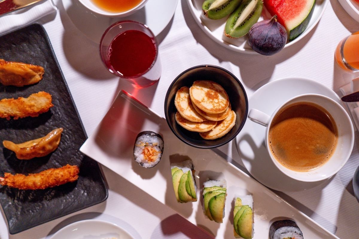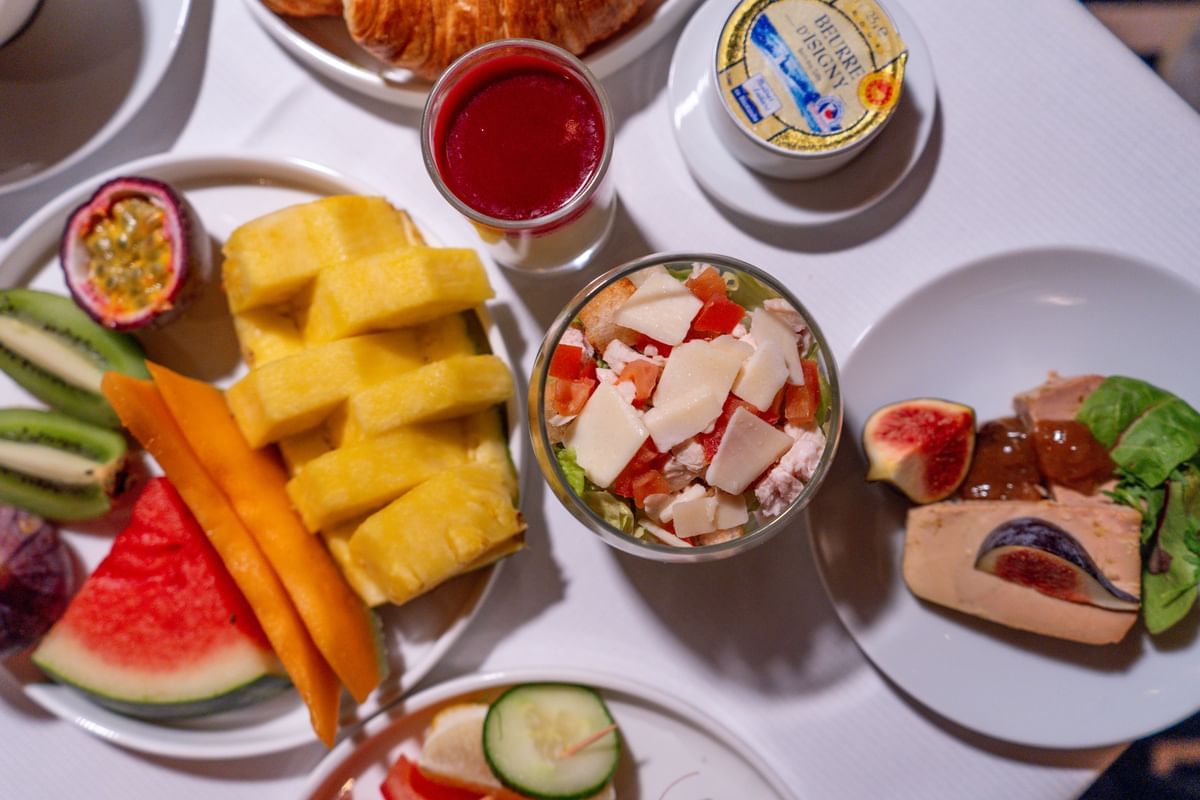 Viennoiseries, brioche, pancakes, madeleines, country bread, citrus marmalade, assorted jams, maple syrup, honey, pastries, chocolate mousse, lemon tart, cheesecake, panna cotta, cookies, macarons, cannelés, lemon cake, chocolate cake, fresh fruit, red fruit salad with verbena, fresh fruit salad, fromage blanc, dried fruits & honey.