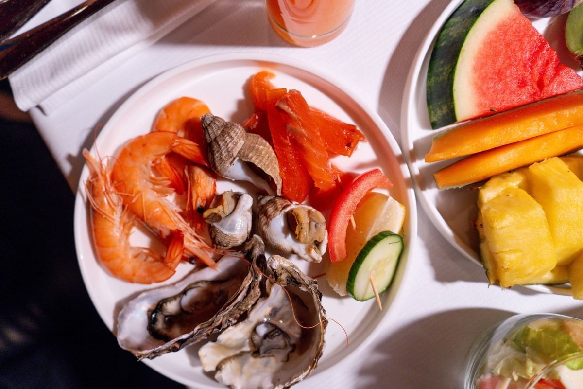 Seafood selection including oysters, whelks, prawns, smoked salmon, salmon gravlax, Parisian-style salmon, grilled vegetable salad with croutons and aged mimolette, avocado and shrimp salad, diced cucumber, fresh radishes, tomato and mozzarella verrines, hummus, maki rolls, quiches, smoked salmon rolls with creamy beetroot, foie gras, pâté en croûte, dry-cured ham, chorizo, coppa, bacon, chicken sausages, scrambled eggs, sautéed mushrooms, gyozas, crispy prawns, and a selection of aged cheeses.